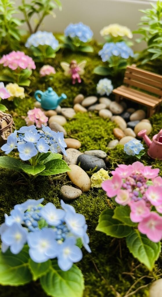 Miniature hydrangea varieties or young plants add whimsical scale to fairy gardens. Their tiny blooms look magical among mosses and small accessories.