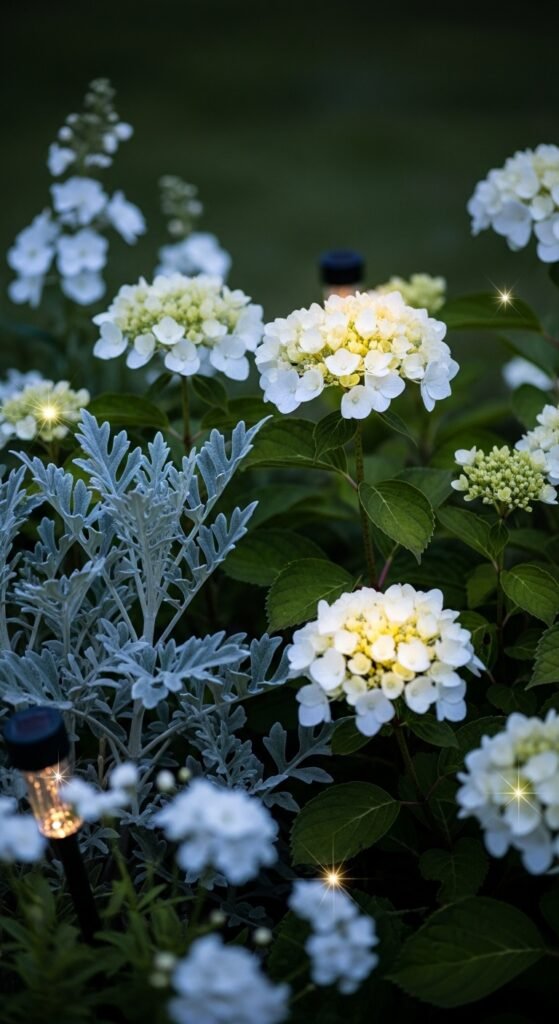 White-blooming hydrangeas like ‘Annabelle’ or ‘Limelight’ shine in a moon garden, reflecting light beautifully at dusk. Plant them alongside other white flowers and silvery foliage for a luminous nighttime retreat.