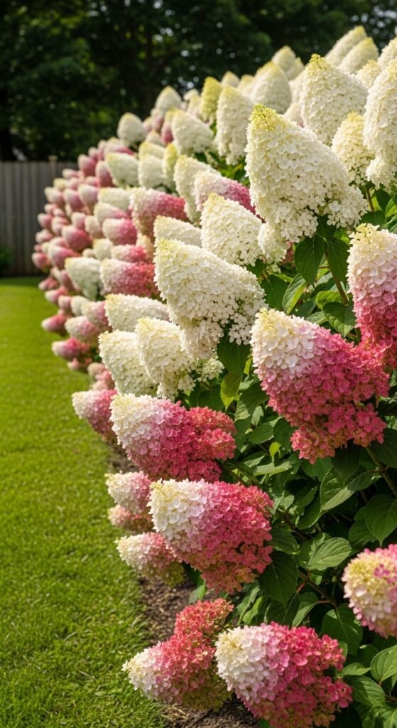 Panicle hydrangeas (Hydrangea paniculata) grow taller and more upright, making them excellent for natural privacy screens. Varieties like ‘Pinky Winky’ or ‘Quick Fire’ reach 6β10 feet and bloom reliably on new wood.