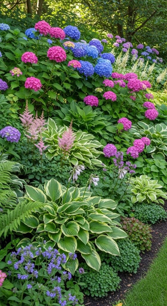 Combine hydrangeas with hostas, astilbe, and ferns for lush, textured layers in shade gardens. The big blooms provide height while groundcovers fill the base. This creates a professional, cohesive look with minimal effort.