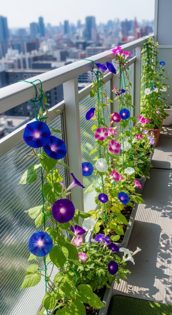 Wrap balcony railings with morning glories for urban charm. Use string or wire for guidance. This adds color to high-rise living. Benefit: Brings nature to small spaces with minimal footprint.