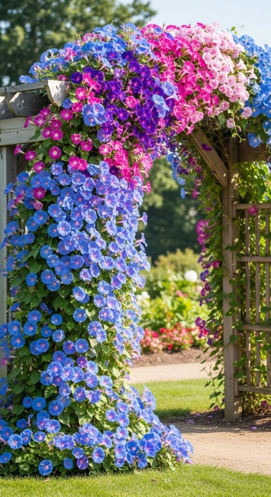 Mix varieties for a rainbow cascade on arbors. Blend blues, pinks, and purples for visual depth. The draw: Creates dynamic color play that evolves daily.