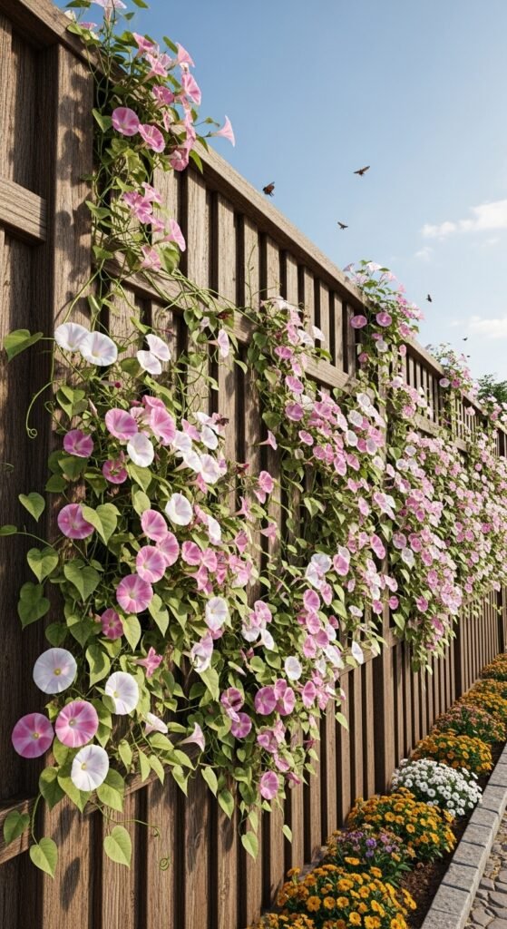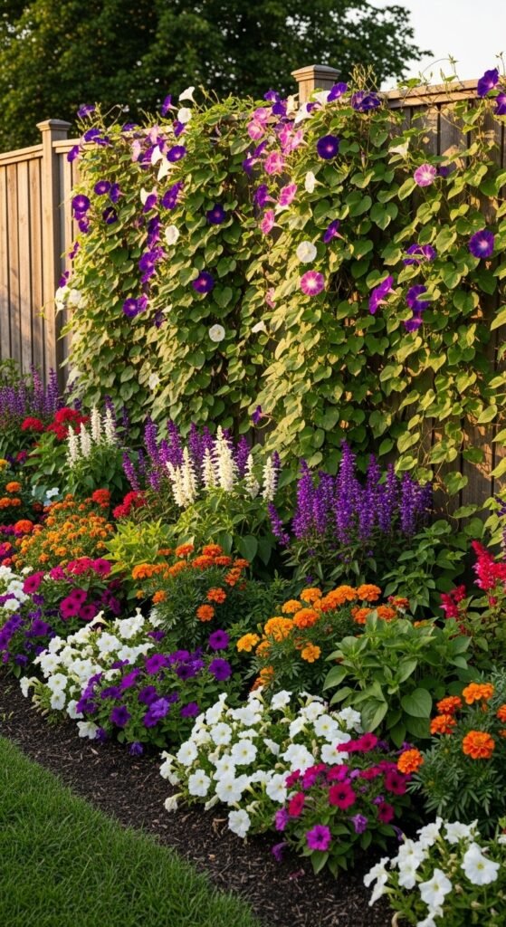 Combine morning glories on fences with ground flowers for layered beauty. Vines provide backdrop, beds add foreground interest. Why harmonious? Offers multi-level appeal in borders.