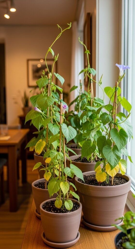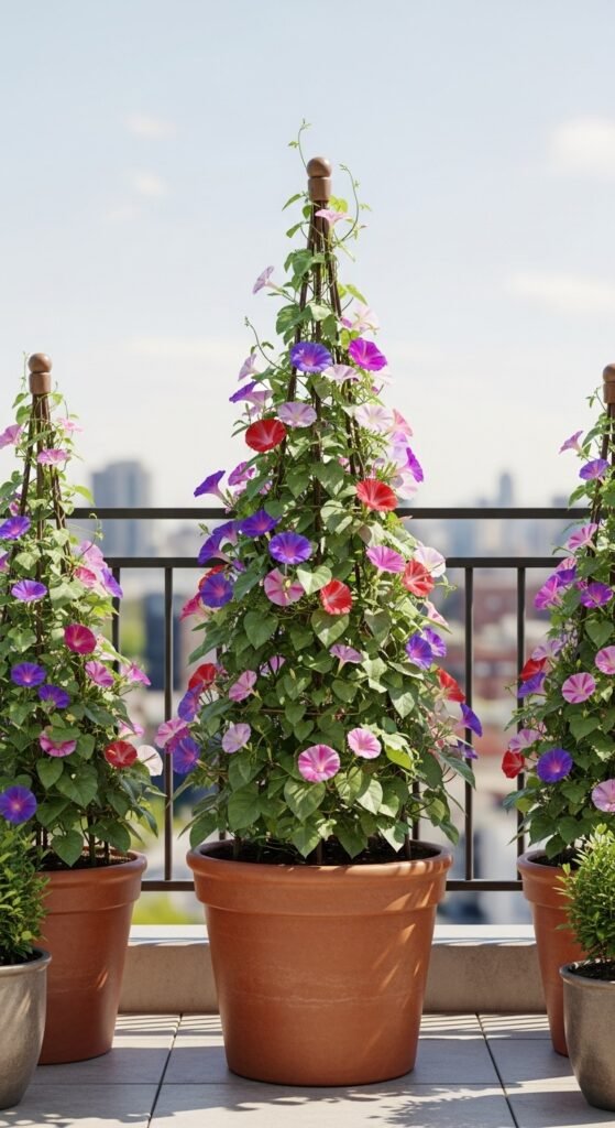 Grow morning glories in large pots for portable beauty on patios or balconies. Use a tall obelisk or teepee in the center for support. This method allows flexibility in placement and suits urban gardeners. Why choose this? It offers versatile decoration without permanent commitments, ideal for renters.