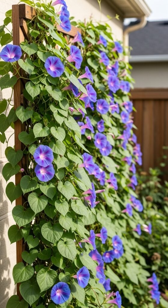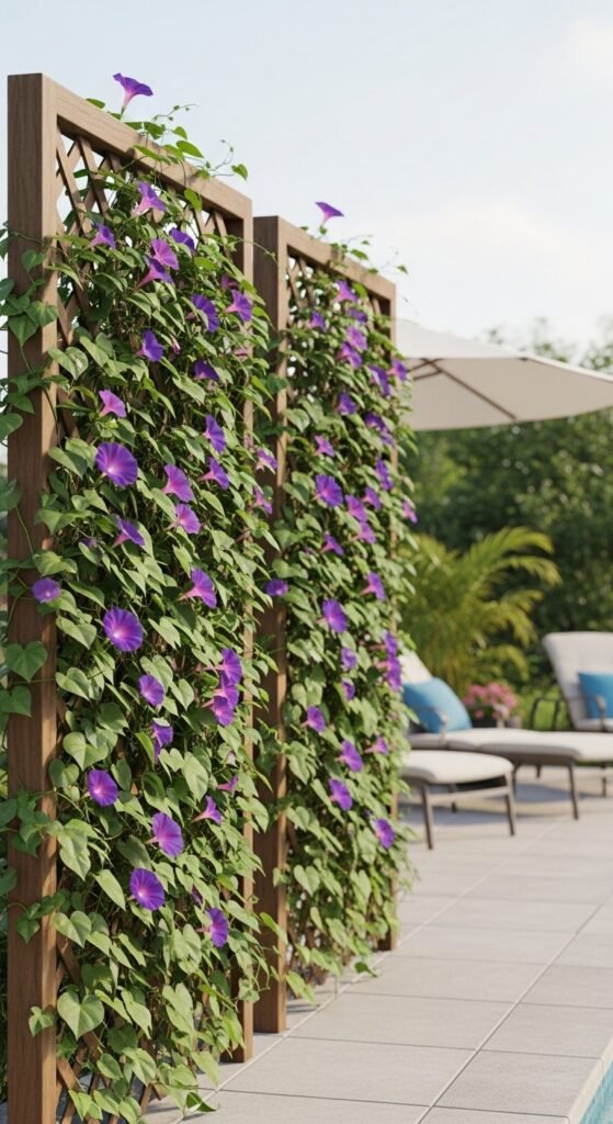 Use morning glories to form natural privacy screens on lattices or fences. Their dense growth blocks views while allowing airflow. Perfect for patios or poolsides. Advantage: Offers seasonal seclusion with easy removal in fall.