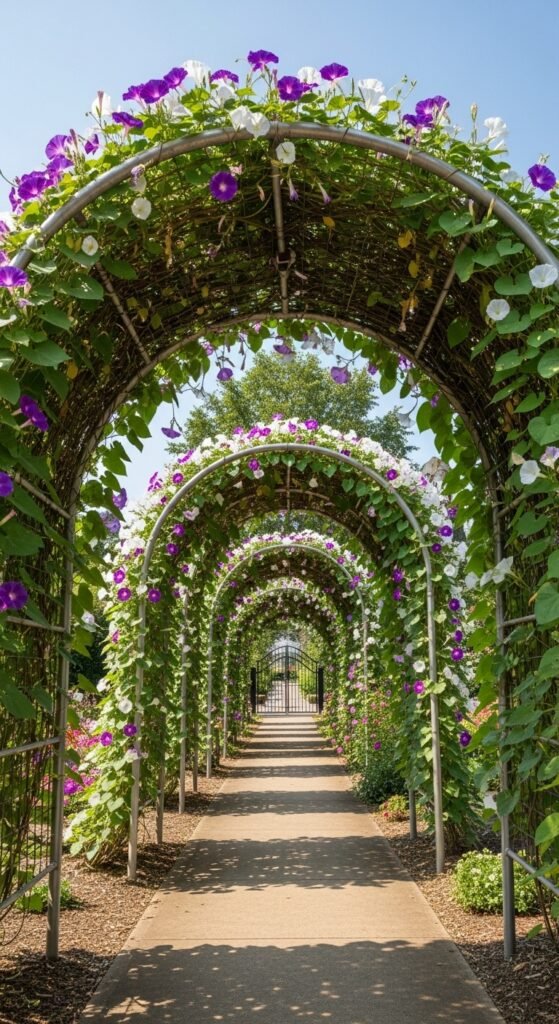 Frame your garden gate or pathway with morning glory-covered arches. Install metal or wooden arches and plant vines on both sides. As they grow, they’ll meet overhead, forming a floral tunnel. The appeal: It creates a welcoming entrance that draws visitors in with natural charm.