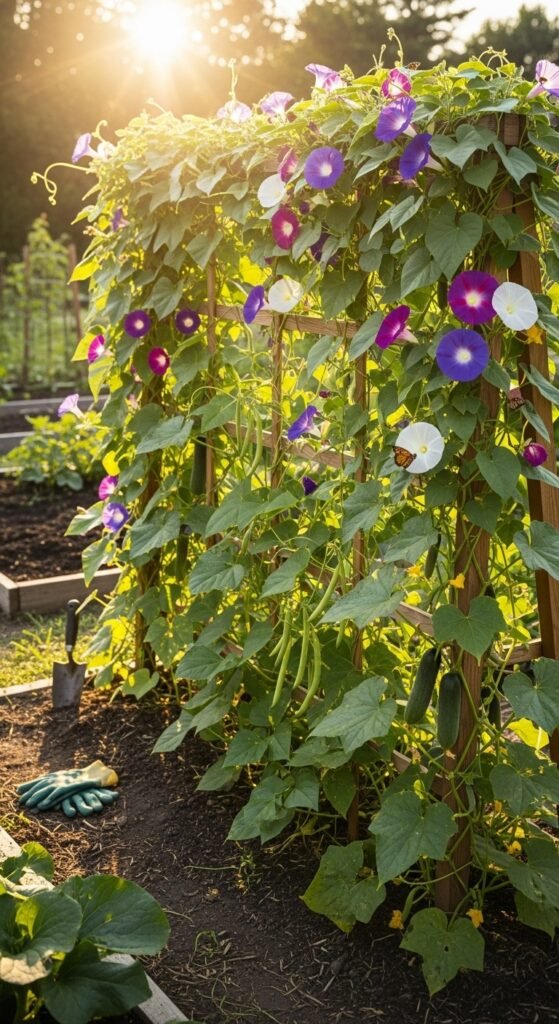 Pair morning glories with veggies like beans or cucumbers on shared trellises. The flowers attract pollinators, boosting crop yields. This polyculture enhances biodiversity. Why effective? It provides mutual support and natural pest deterrence.