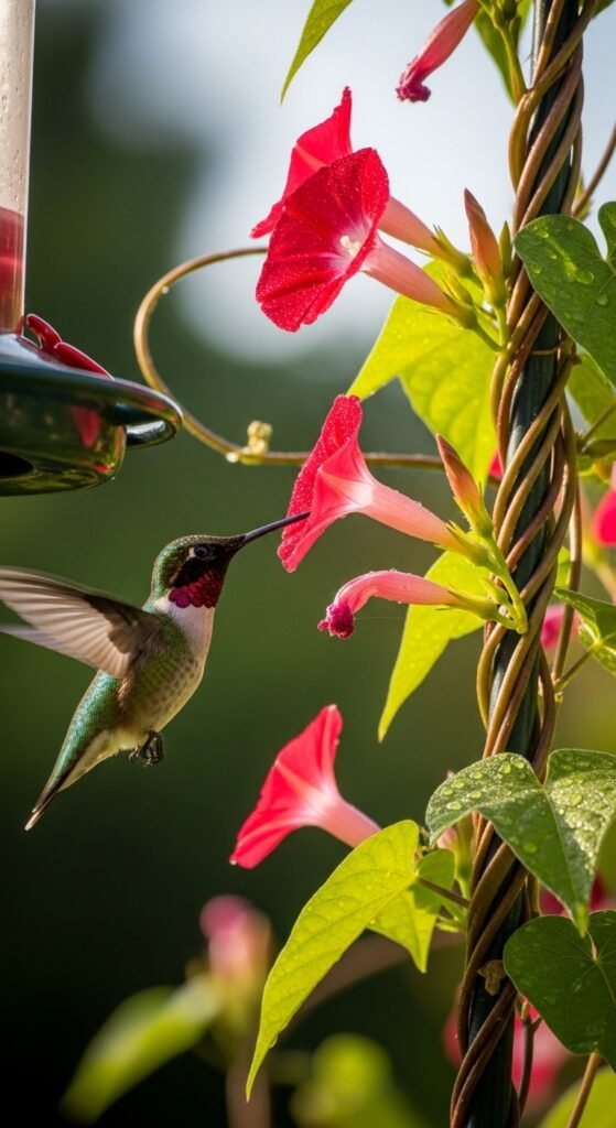 Attract hummingbirds by planting red or pink morning glories near feeders. The tubular flowers provide nectar, creating a wildlife hotspot. The perk: Encourages biodiversity and offers delightful birdwatching opportunities.