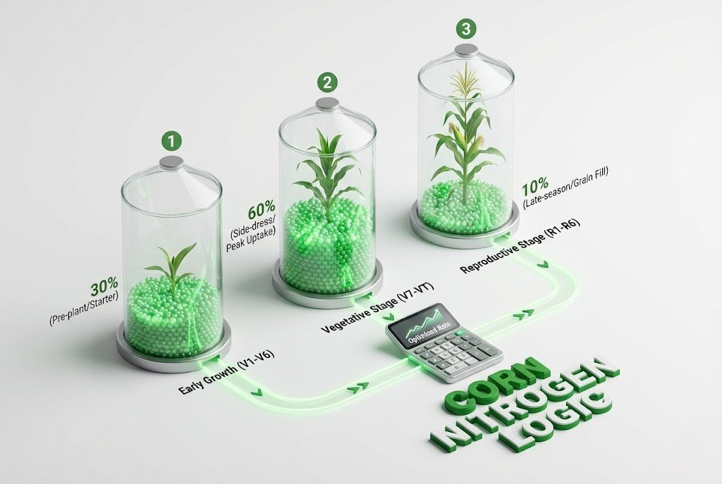 Our calculator splits the dosage: 30% early, 60% at knee-high, and 10% at tassel. This mirrors commercial farming practices scaled down for the home gardener.