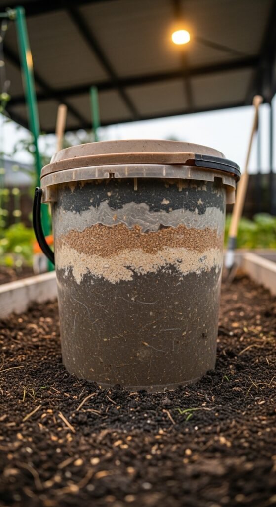 Layer waste with bran in a bucket, drain liquid for dilution as fertilizer, then bury solids. Use the tea weekly. This urban-friendly method is detailed in our bokashi composting guide.
