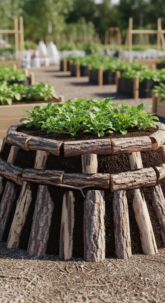 Layer logs, branches, and greens, cover with soil. Plant directly into the mound. It’s low-maintenance and sustainable. For construction details, visit our hugelkultur bed page.