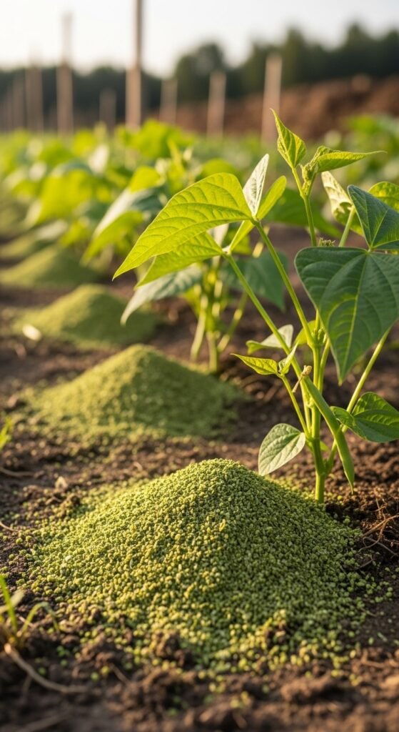 You scatter alfalfa meal, ground from alfalfa plants, as a gentle organic fertilizer offering nitrogen, potassium, and growth hormones like triacontanol to stimulate vegetable root and shoot development.