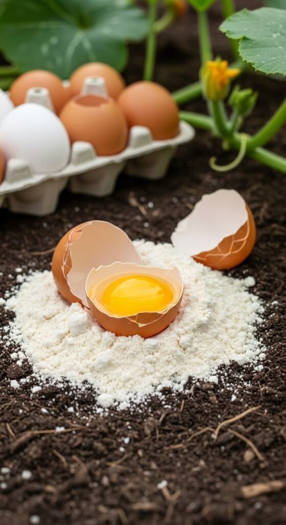 You grind clean eggshells into powder for a calcium boost, preventing deficiencies in vegetables prone to rot, such as squash and cucumbers.