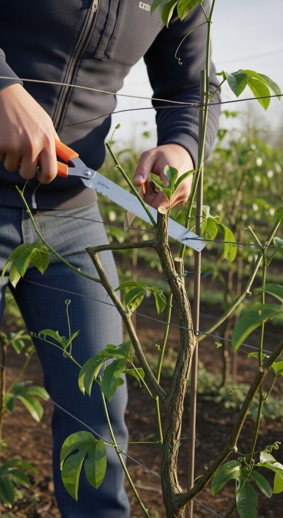Pruning is essential in passionfruit vine care to shape the plant, remove dead wood, and encourage new growth. Trim in late winter or early spring, cutting back to 3-5 main stems and shortening laterals to 2-3 buds for better light penetration and air flow.