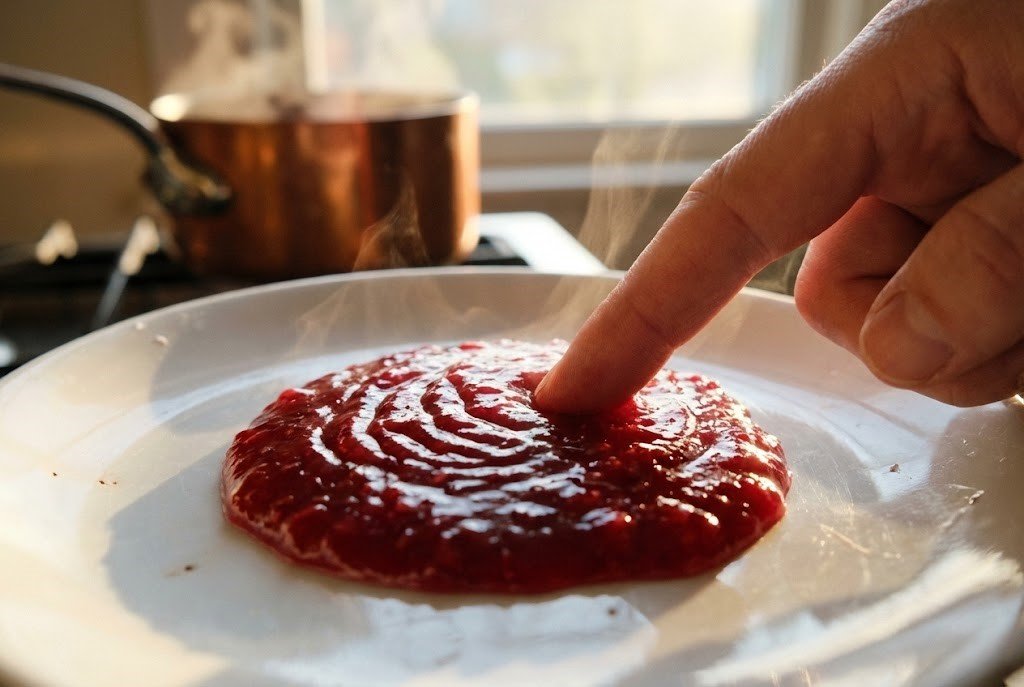 Even with a calculator, always test your jam before canning. Place a small plate in the freezer before you start cooking. Drop a teaspoon of hot jam onto the cold plate. Wait 30 seconds and push it with your finger. If it wrinkles like skin, the set is good. If it stays liquid, boil for another 2 minutes and re-test.