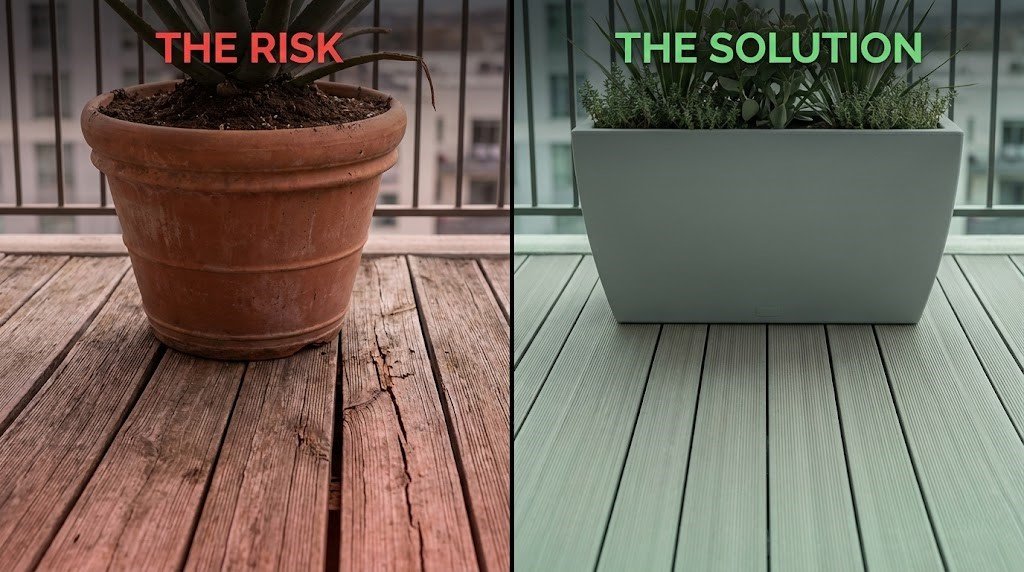 The “Secret Sauce” of our tool is the Square Foot Load Calculation. Most residential balconies and wooden decks are built to support a “Live Load” of roughly 40 to 60 lbs per square foot. If you place a 2×2 foot planter that weighs 400 lbs, you are exerting 100 lbs per square foot on that specific spot.
