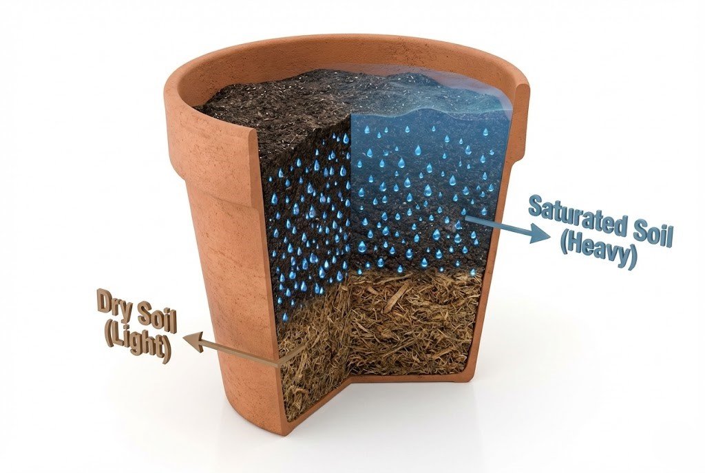 A: Water is heavy (8.34 lbs per gallon). A large planter can easily hold 5-10 gallons of water in the soil’s pore spaces after a rainstorm, adding 40-80 lbs instantly.