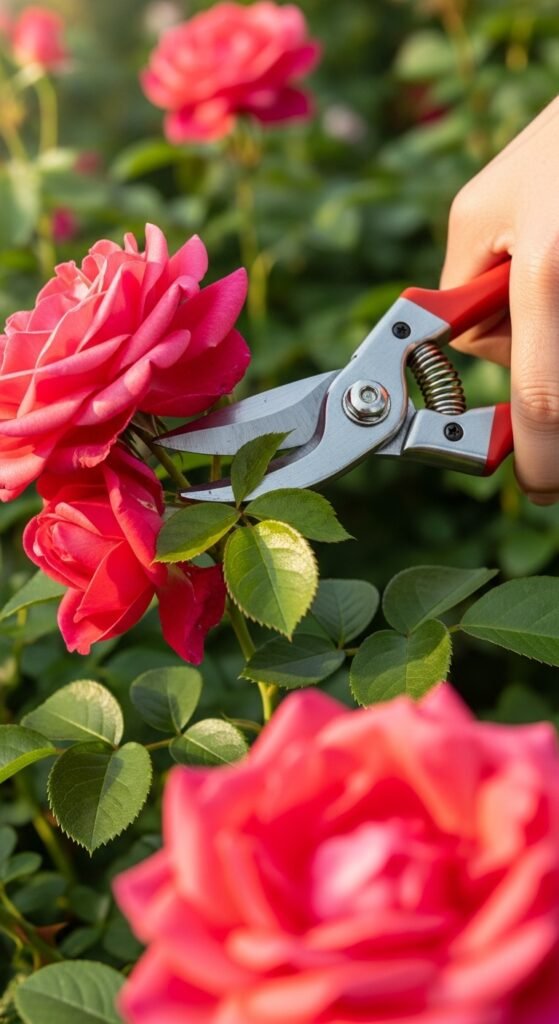 You snip off faded flowers just above the first set of five leaflets to encourage reblooming. Why deadhead? It redirects energy from seed production to new buds, extending the flowering season. How: Use bypass pruners for clean cuts, doing this weekly during peak bloom to keep bushes tidy and vigorous.