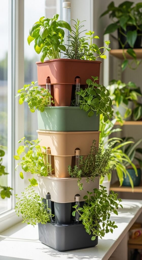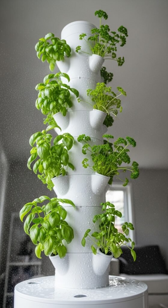 You may assemble an aeroponic tower where herbs are misted with nutrient water from an internal reservoir, promoting fast, soil-free growth vertically.