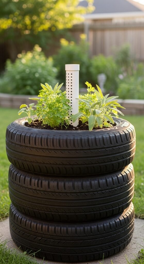 You could stack old tires to form a tiered planter with a central reservoir tube for self-watering, recycling materials into functional herb homes.