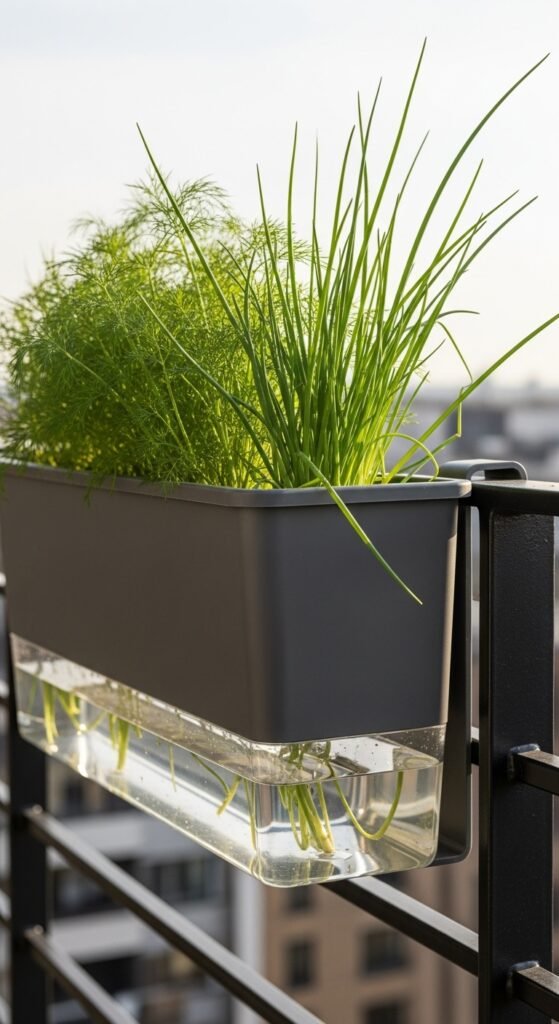 You can attach elongated boxes to balcony rails with built-in reservoirs, allowing herbs to self-water while maximizing urban space.