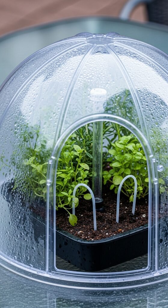 You might use a small dome greenhouse over herb planters integrated with drip emitters from a reservoir for controlled, self-watering environments.