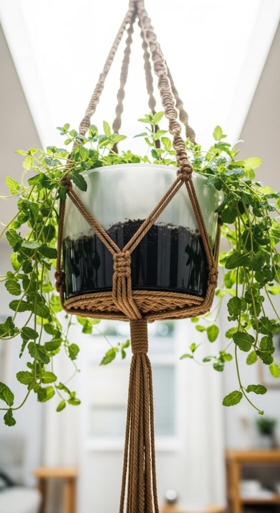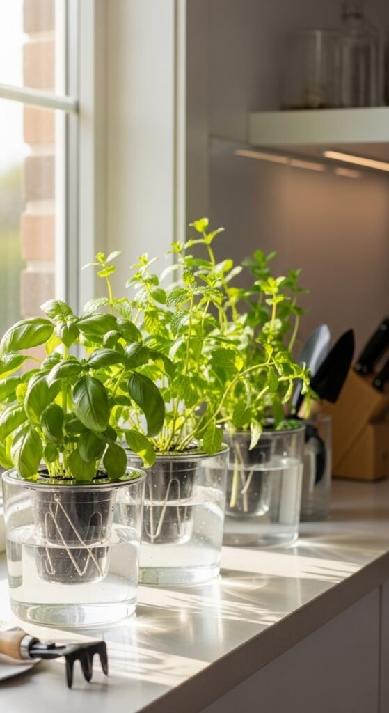 This idea provides transparency and portability, making it easy to monitor and move herbs like cilantro indoors. It’s an affordable, stylish option for small-scale gardening.
