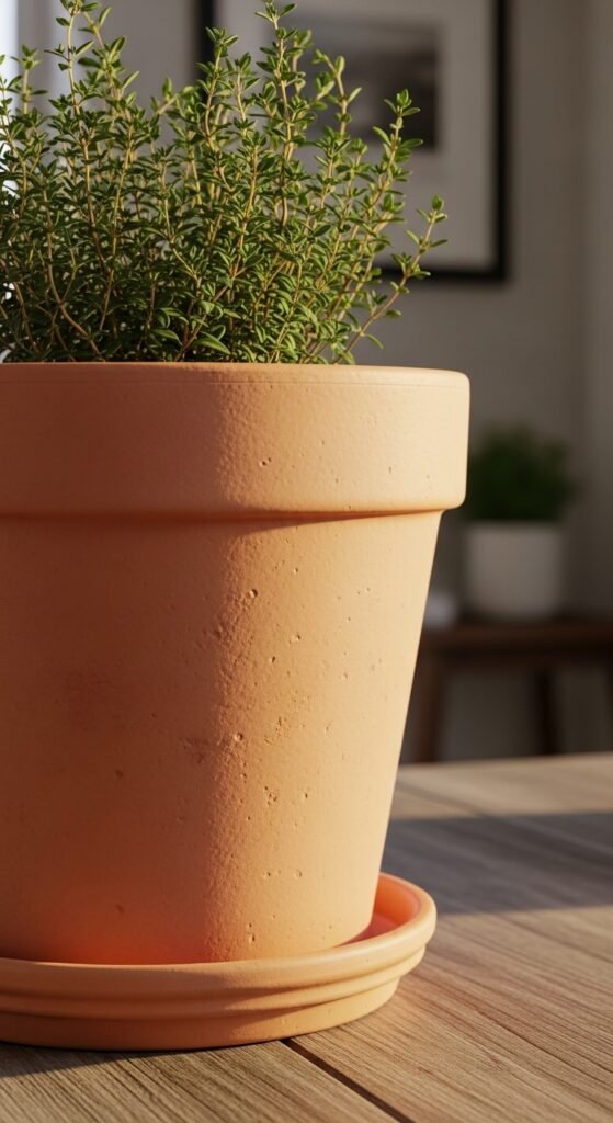 You can utilize traditional terracotta pots enhanced with integrated saucers that act as reservoirs for self watering. The porous material allows water to seep upward through capillary action, keeping soil evenly moist for herbs such as thyme.
