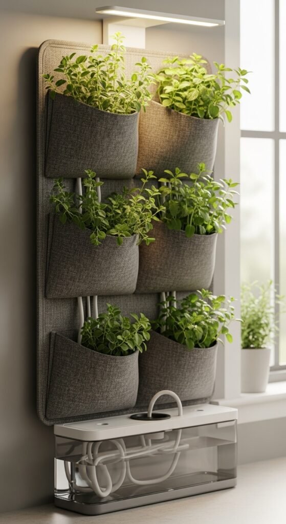 You could install a vertical wall planter using fabric pockets or modular units with wicking mats that draw water from a bottom reservoir upward to multiple herb levels. This space-saving design is ideal for apartments or kitchens.