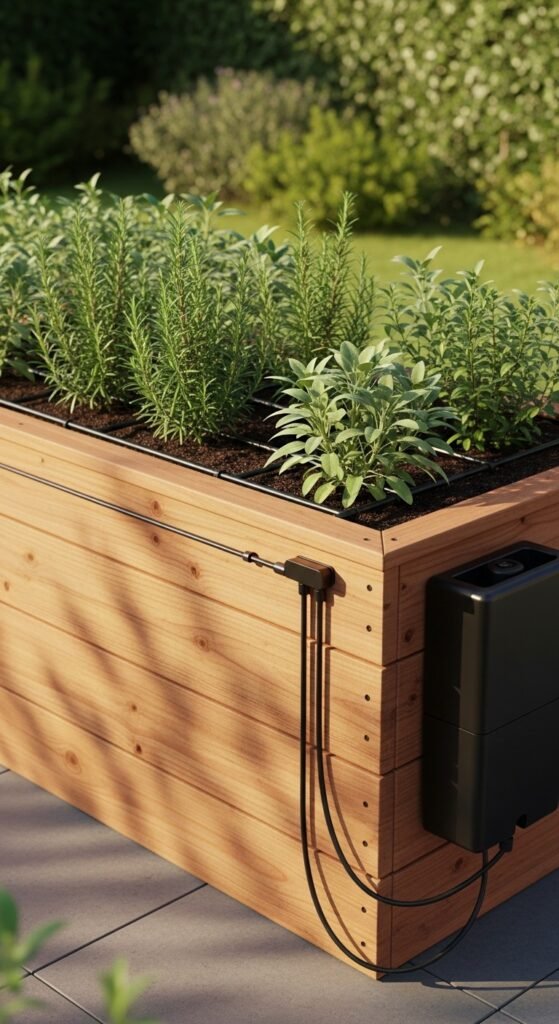 You may construct a raised bed planter incorporating drip irrigation lines connected to a reservoir for automated watering of herbs. This elevated setup improves accessibility and soil quality.