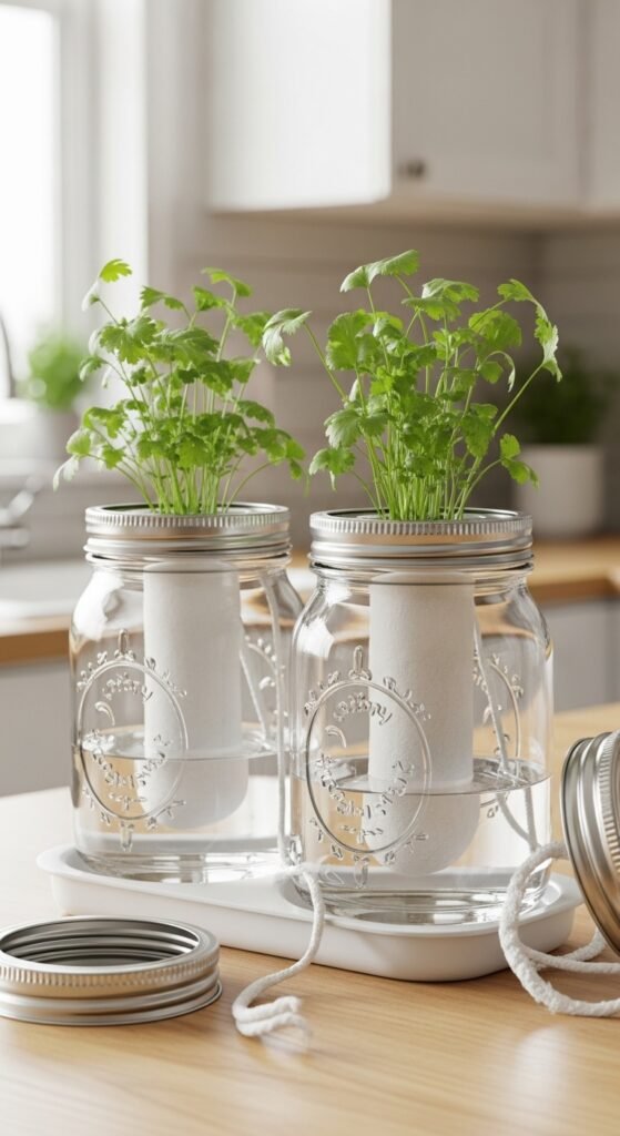 Drill holes in lids for wicks, fill jars with soil, insert herbs, and place over a water-filled base. Check and refill periodically. Pair this with concepts from self watering planters for variations.