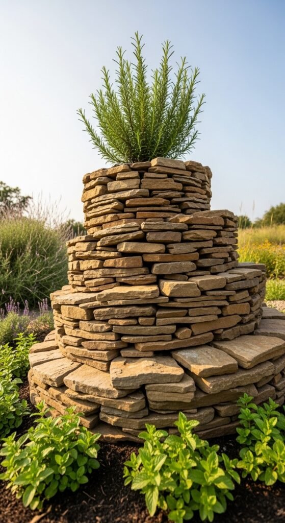The key benefits include excellent drainage and heat retention from the stones, which extend the growing season. It also adds a rustic charm to your garden, blending seamlessly with surrounding flora. To implement, mark a spiral outline on the ground, about 3-4 feet in diameter, and build walls up to 2-3 feet high. Fill with a mix of compost and soil, planting herbs according to their needs. For complementary ideas, consider integrating elements from a keyhole garden for enhanced accessibility.