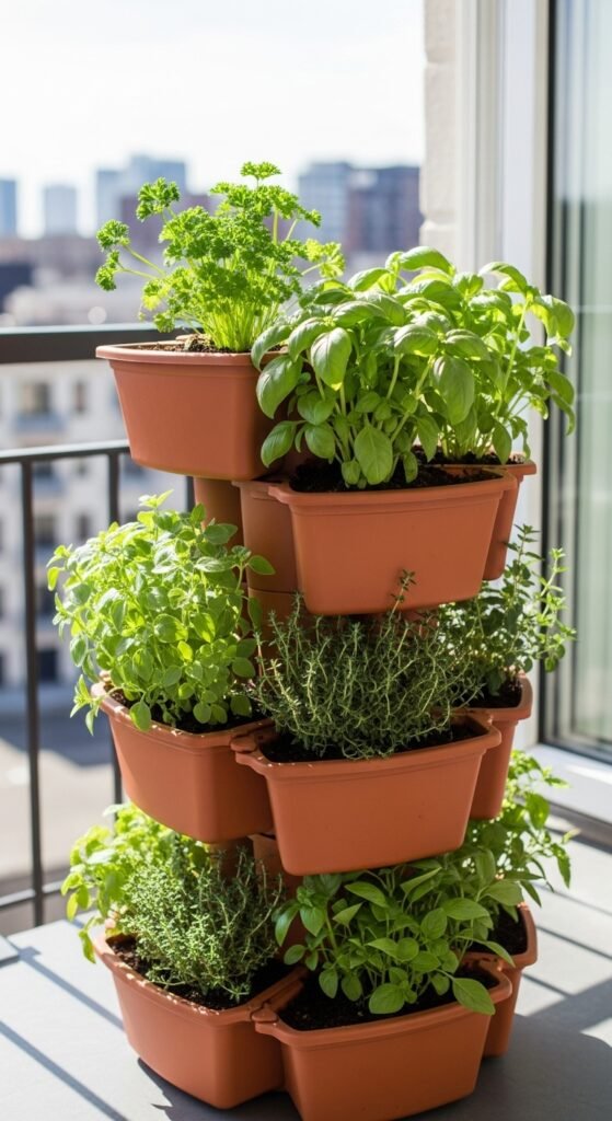 Watering is straightforward with drip systems; you ensure drainage to prevent root issues. This idea transforms your balcony into a functional herb oasis, enhancing daily meals with homegrown flavors.