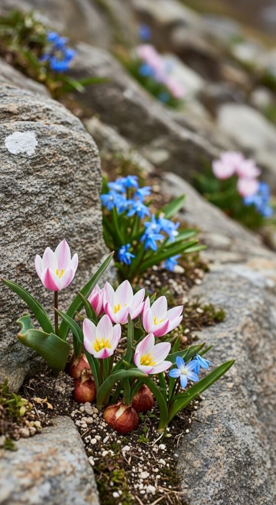 You enhance rocky landscapes by tucking spring bulbs into crevices or around stones, where dwarf varieties like mini tulips shine against the rugged backdrop. This adds softness to hardscapes.
