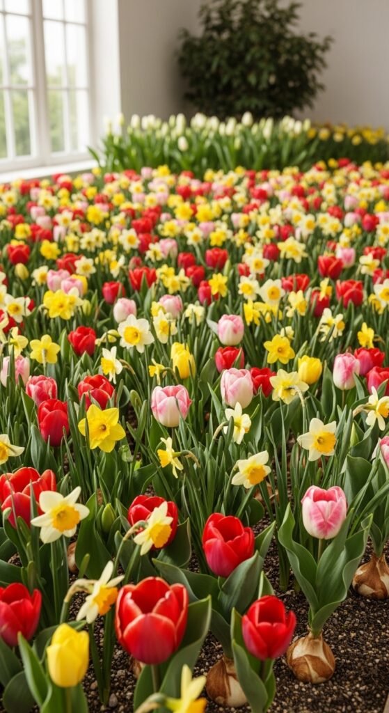 You curate a harmonious palette by selecting spring bulbs in complementary colors, such as all-white snowdrops and hyacinths for purity or vibrant reds and yellows for energy. Group them in beds for thematic impact.
