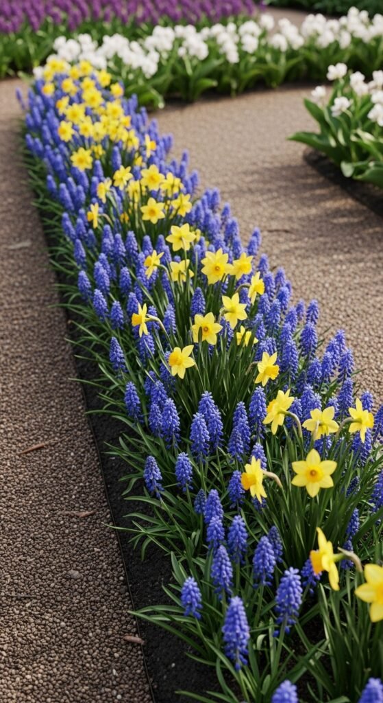 You define garden paths or beds with spring bulbs planted along edges, creating neat borders that bloom vibrantly. Low-growing options like grape hyacinths or mini daffodils work best, framing your space with color.