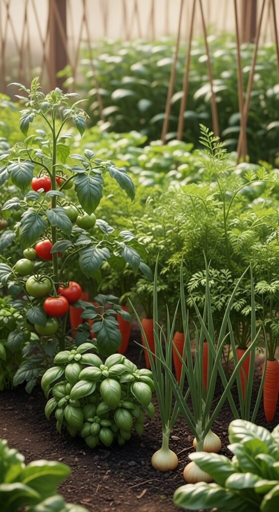 You can enhance your spring vegetable garden by employing companion planting, where compatible plants are grown together to mutual benefit. For instance, pair tomatoes with basil to repel pests naturally, or interplant carrots with onions to deter carrot flies. This technique improves biodiversity and can lead to higher overall productivity.