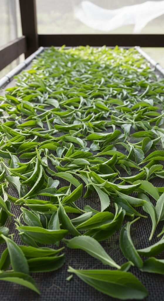 Dry stevia leaves in a warm, shaded area with good ventilation, spreading them in a single layer to prevent mold. Once crisp, store in airtight containers away from light to retain potency.