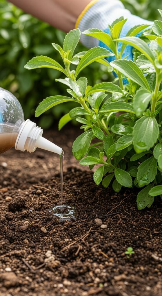 Fertilize stevia sparingly with a balanced, organic product every four to six weeks during the growing season, avoiding high-nitrogen formulas that favor foliage over sweetness. Dilute to half strength to prevent burn.
