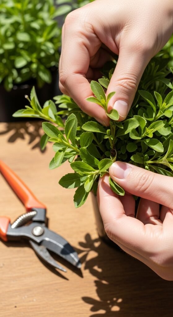 Harvest stevia leaves in the morning when sweetness is peak, picking individual leaves or cutting stems just before flowering for the best flavor. Regular harvesting stimulates new growth.