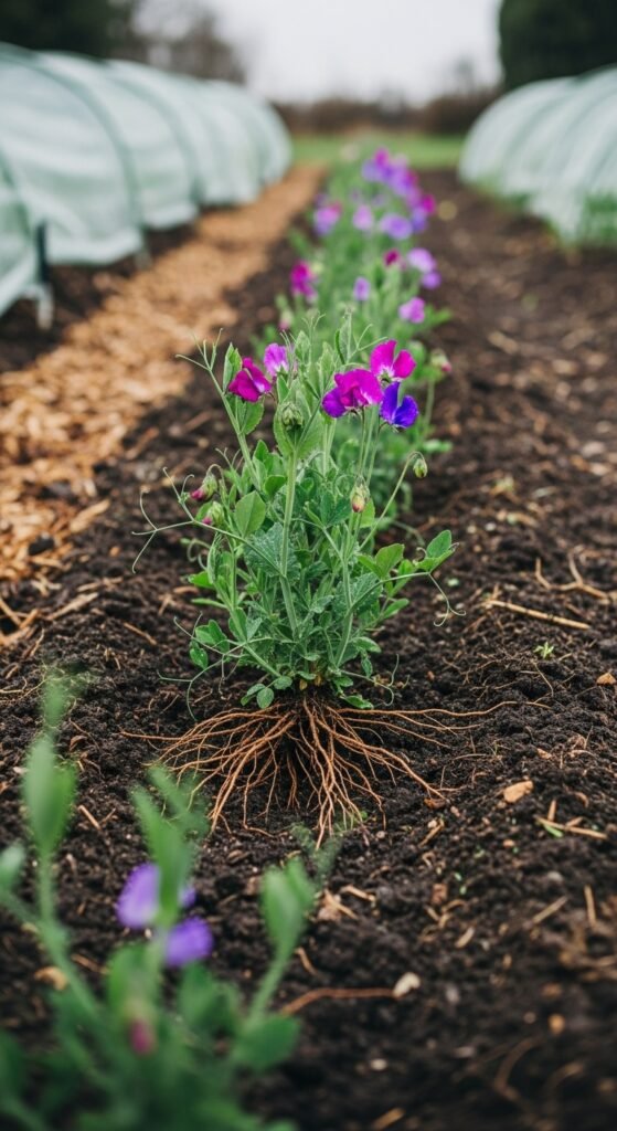 Sow sweet peas in fall for earlier spring blooms in suitable climates. This technique yields stronger plants with deeper roots resisting heat.