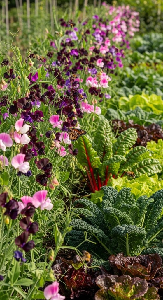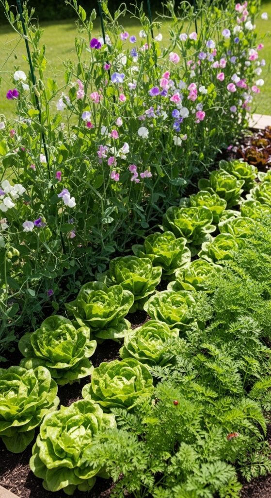 Pair sweet peas with vegetables like lettuce or carrots, where they provide shade and fix nitrogen in the soil. The benefit is improved soil health and pest deterrence, creating a balanced ecosystem.