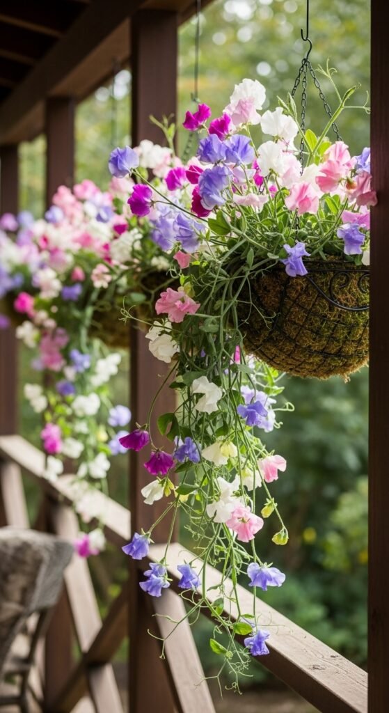 Suspend baskets of trailing sweet peas for elevated charm. Delivers overhead fragrance in porches or trees.