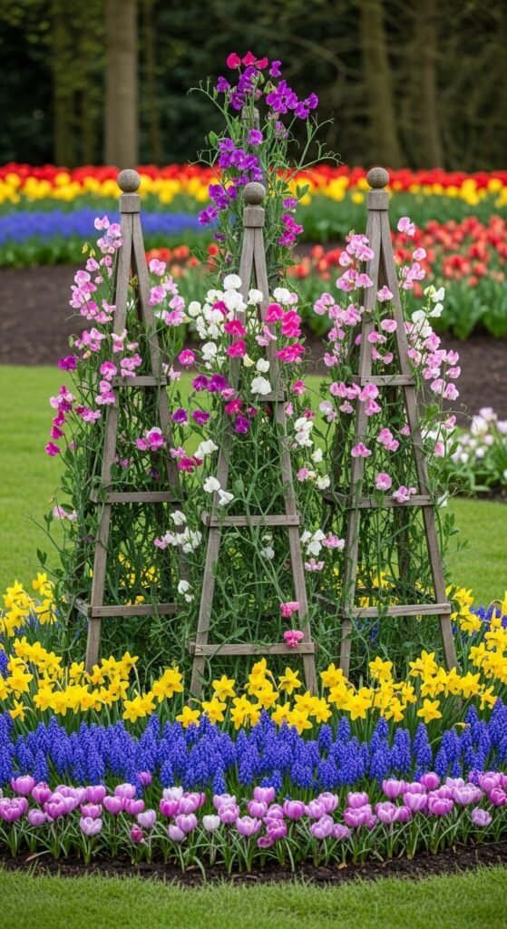 Designate sweet peas as the centerpiece in spring beds, surrounding with bulbs. Creates early-season spectacle awakening the garden.