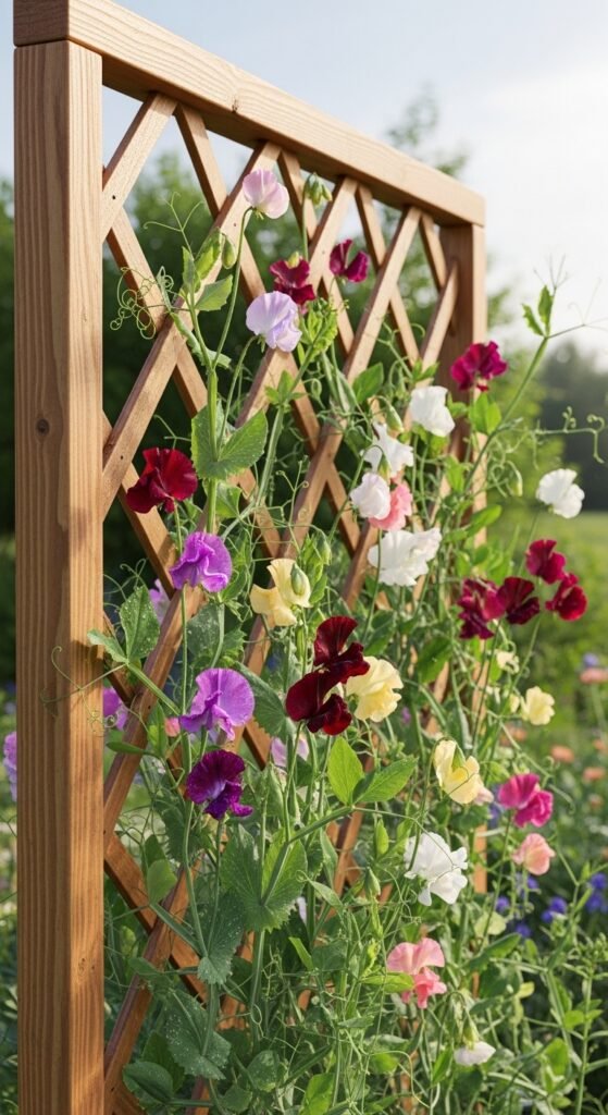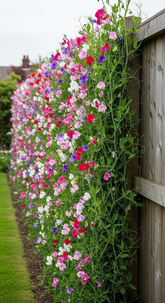 Train sweet peas along a chain-link or wooden fence to create a natural privacy screen. The why includes enhanced seclusion with added beauty and scent.