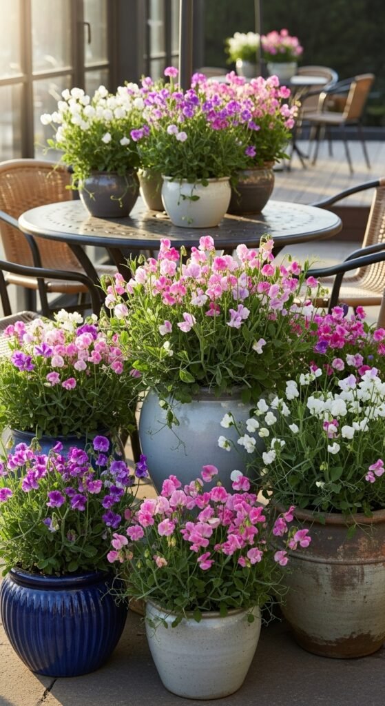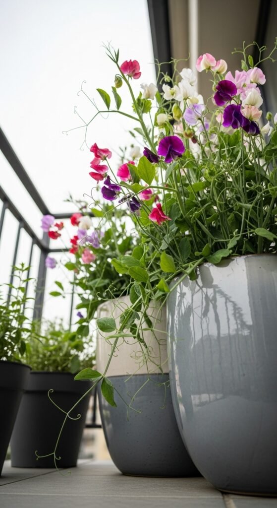 You can grow sweet peas in large pots or hanging baskets, letting vines trail elegantly over the edges. This idea is ideal for balconies or patios where ground space is limited, offering portable fragrance that you can reposition as needed.
