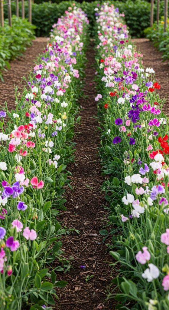Blend sweet peas with perennials like lavender or roses for a layered look. This idea provides seasonal variety, with sweet peas filling early gaps.