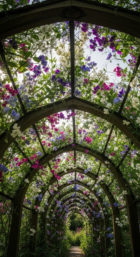 Create a tunnel of sweet peas over a garden path using arched supports. This immersive idea offers sensory delight, with fragrance enveloping you as you stroll through.