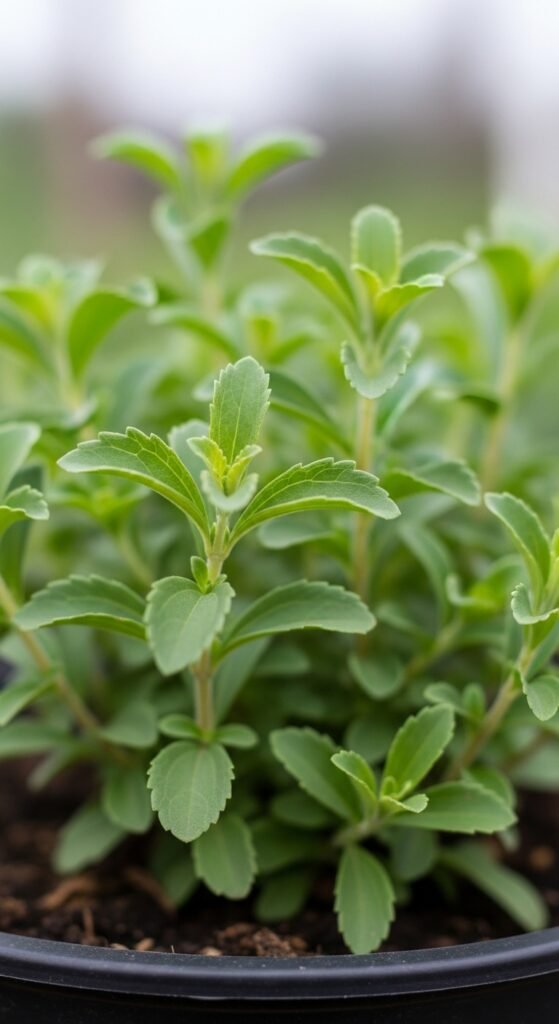 Stevia sweetens teas naturally without calories, ideal for diabetics. This tender perennial needs sun and well-drained soil. Key benefits include zero-glycemic impact and dental health. Grow indoors in cool areas, per stevia plant care.