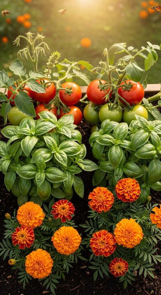 You can enhance tomato growth by planting compatible companions like basil, marigolds, or onions. These deter pests, improve pollination, and optimize space usage.